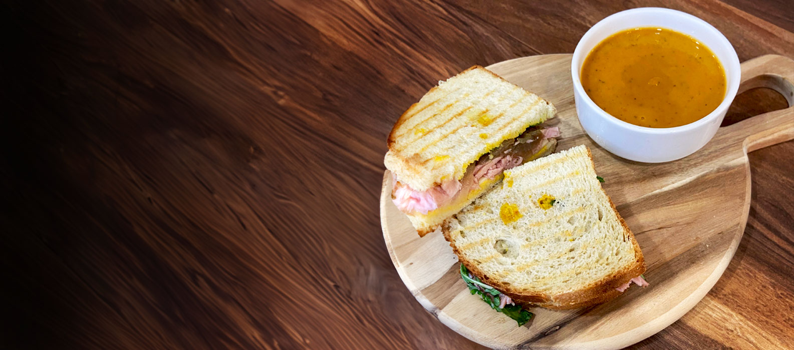Offrez-vous une pause bien méritée avec un menu frais et coloré de type bistro. Dégustez un potage, un pain bistro, un panini, un dessert, etc., le tout accompagné d’un délicieux café!